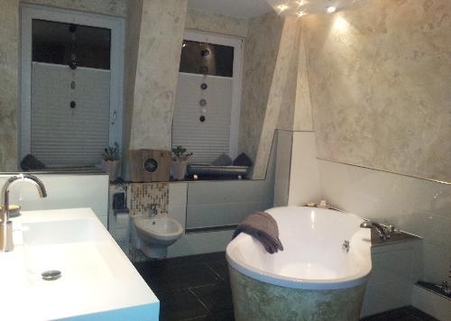 Traumbad mit begehbarer Dusche, gr.Waschtisch, Badewanne für 2, Bidet, WC und Fußbodenheizung ;-)